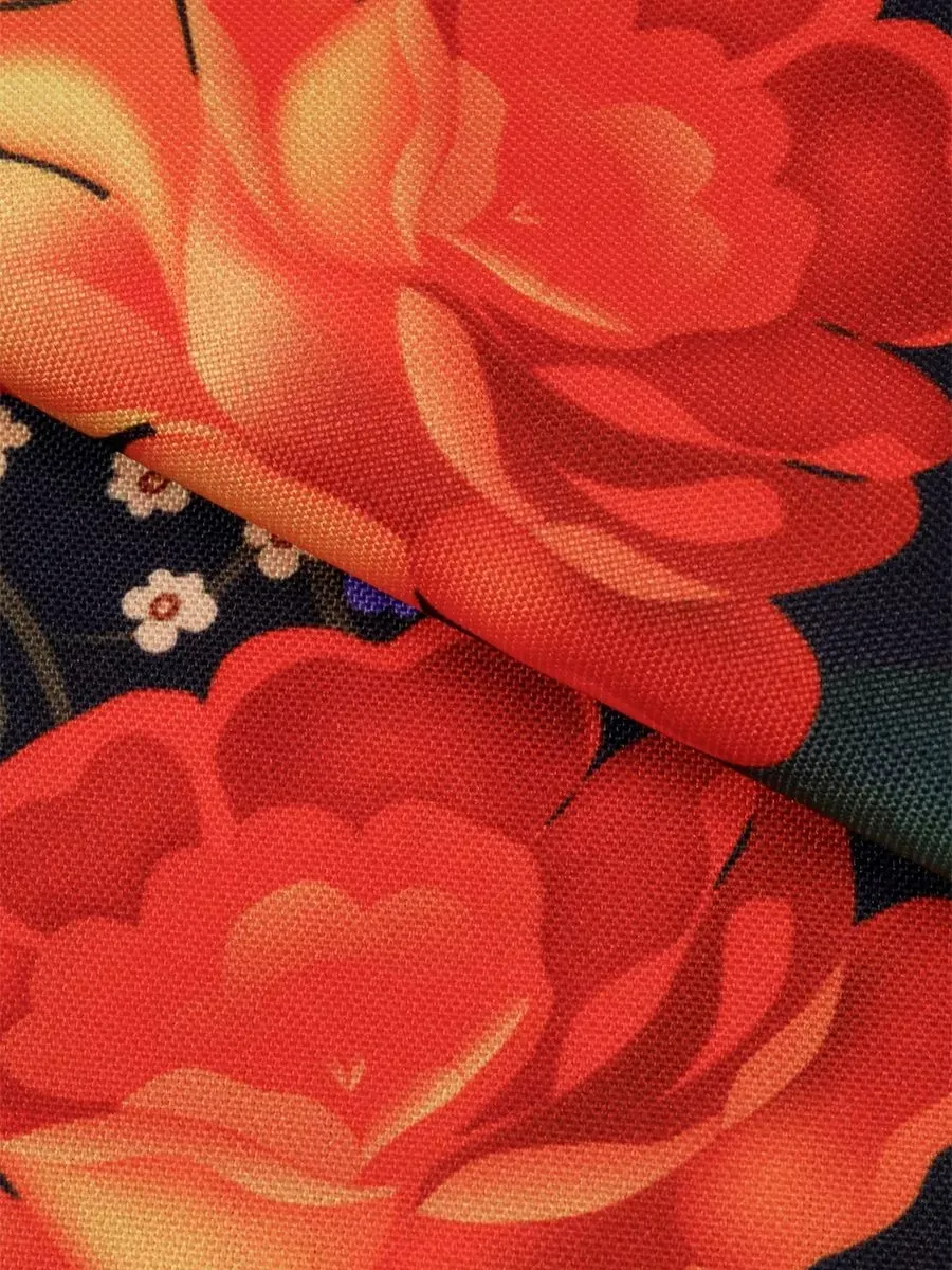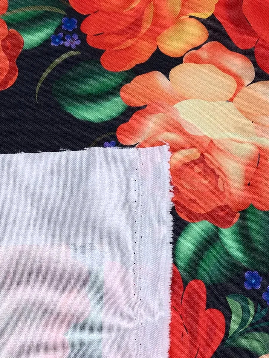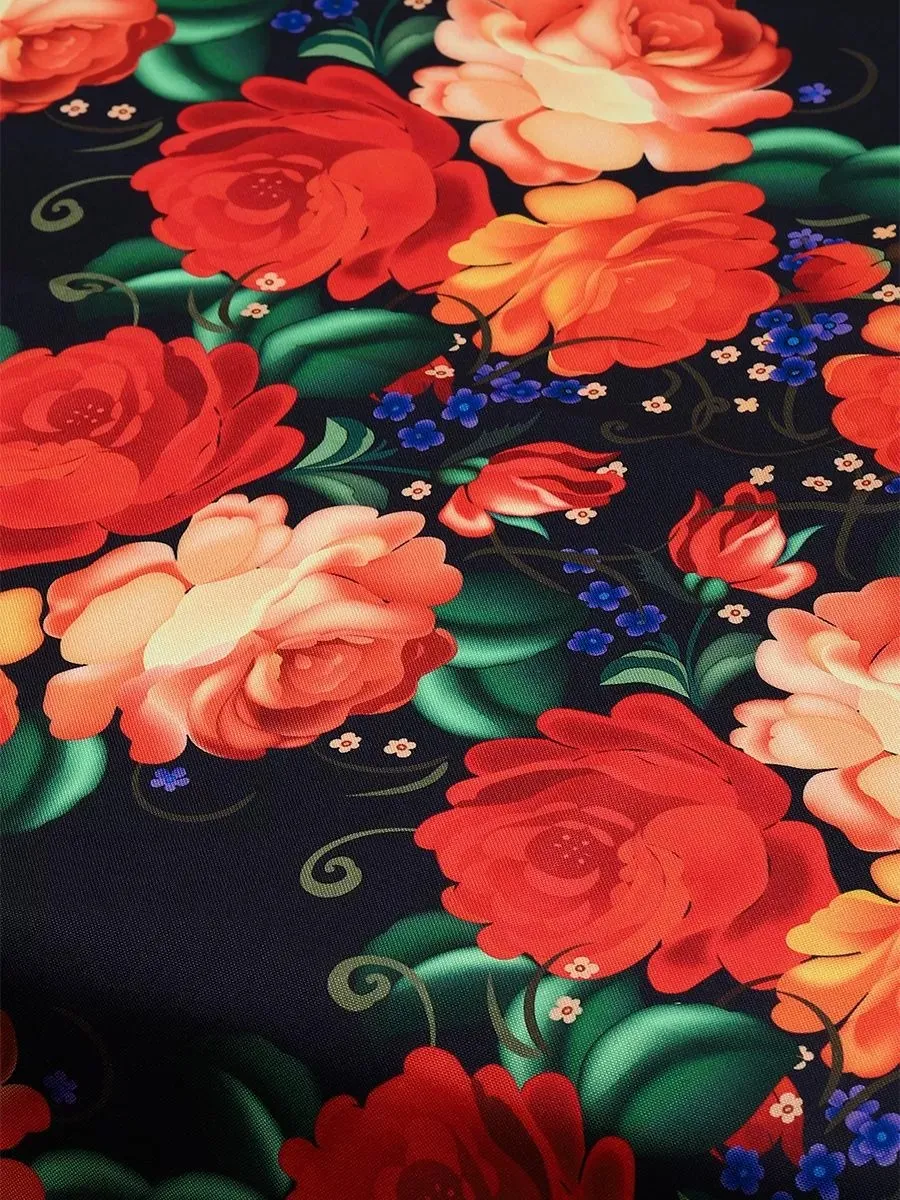 Габардин представляет собой ткань полотняного переплетения с узором, нанесённым сублимационной печатью. Материал устойчив к механическим повреждениям, не мнется, приятен на ощупь и не пиллингуется.