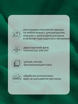 Ткань Флис двусторонний — нетканый материал из синтетических волокон, приятный на ощупь, объемный и мягкий. Полотно хорошо тянется, при этом не растягивается в процессе носки. Его особенностью является возможность использования обеих сторон. Благодаря антипилинговой обработке ворс Флиса не скатывается и не теряет свою структуру. Флис отлично отводит влагу, проводит тепло и обладает высокой прочностью, а готовые изделия очень комфортны.